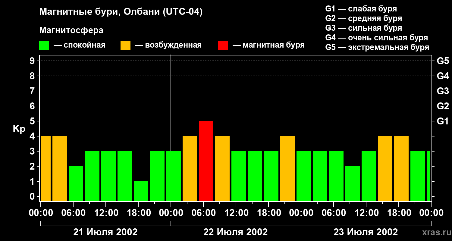 Изменения геомагнитного индекса Kp с 21 по 23 июля 2002 года для средних широт
