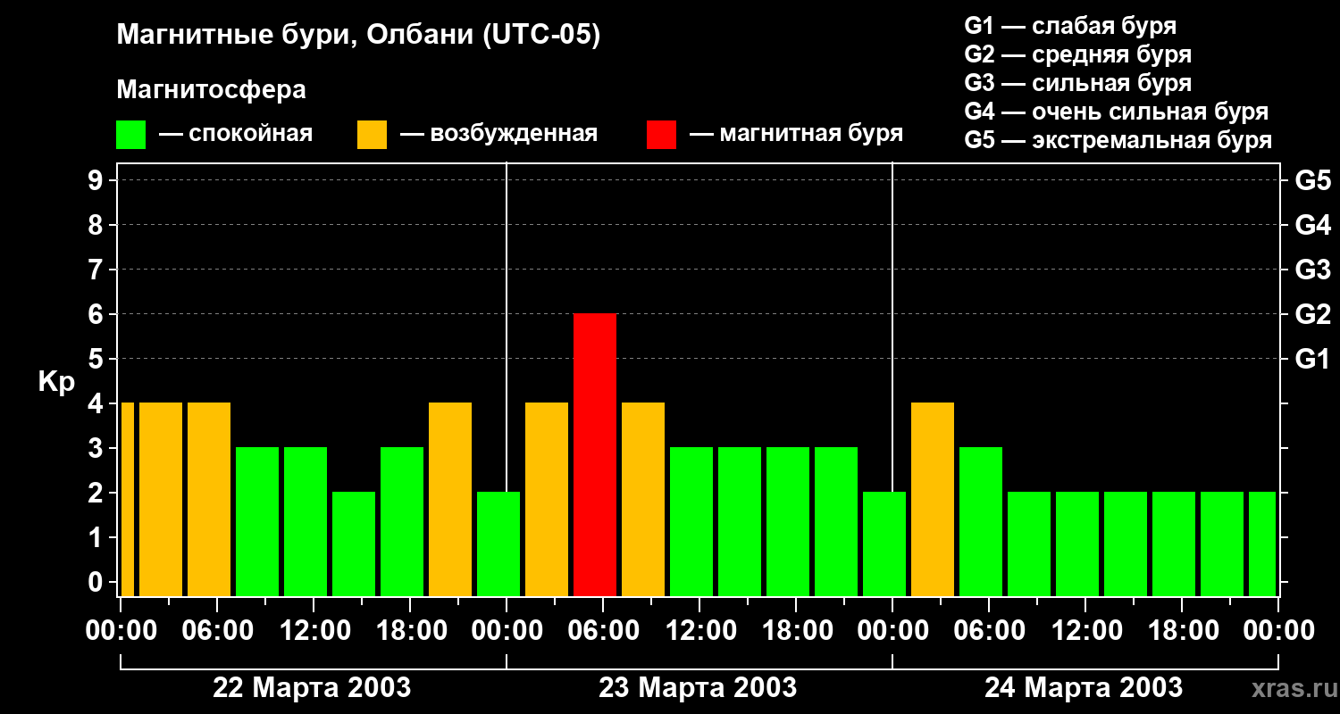 Изменения геомагнитного индекса Kp с 22 по 24 марта 2003 года для средних широт