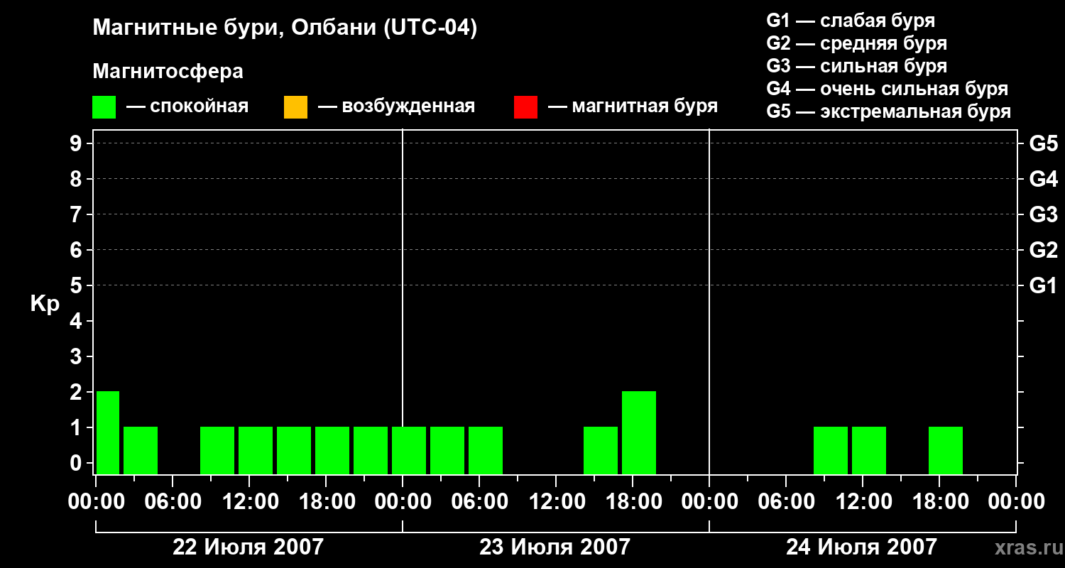 Изменения геомагнитного индекса Kp с 22 по 24 июля 2007 года для средних широт