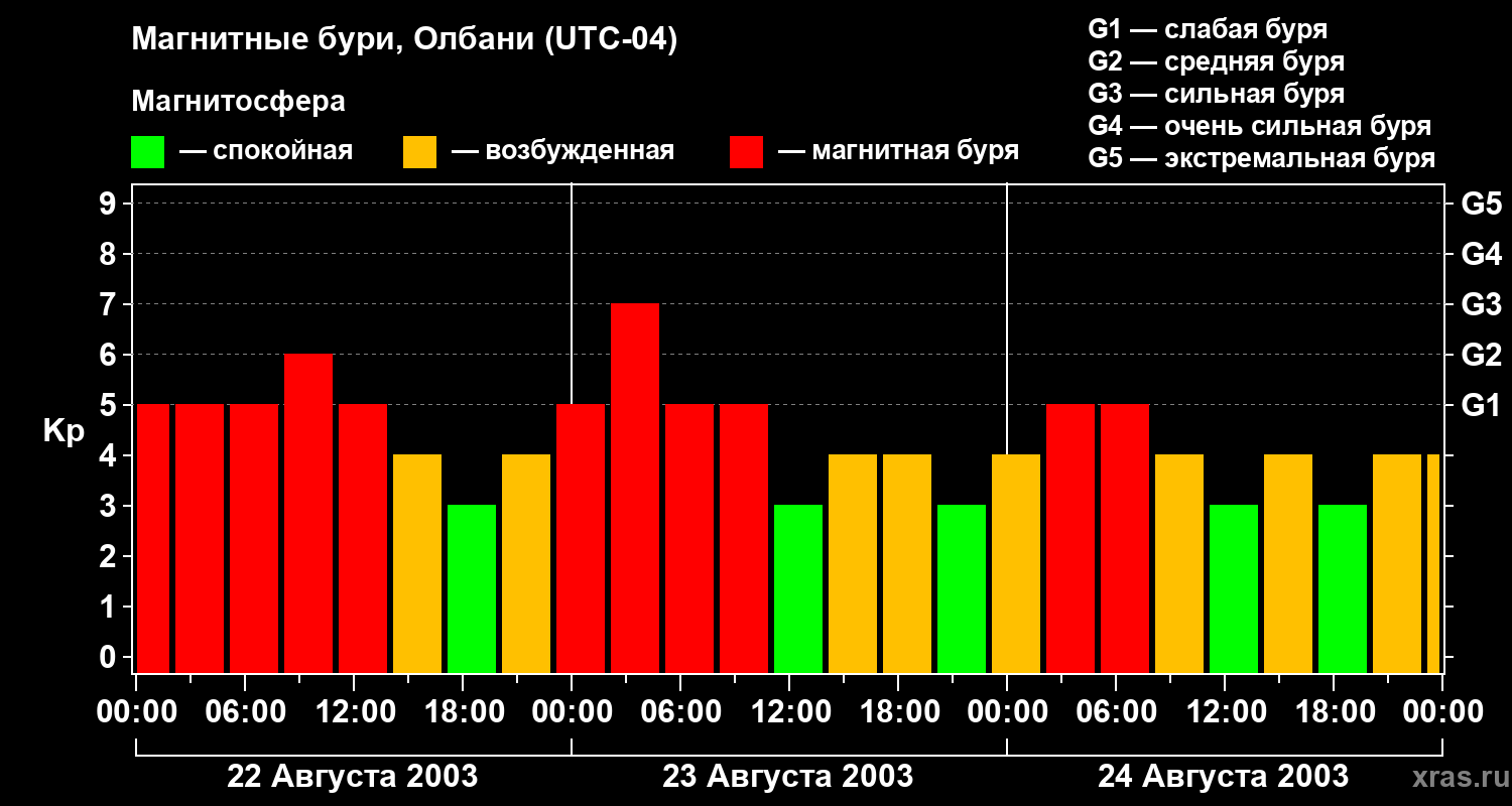 Изменения геомагнитного индекса Kp с 22 по 24 августа 2003 года для средних широт