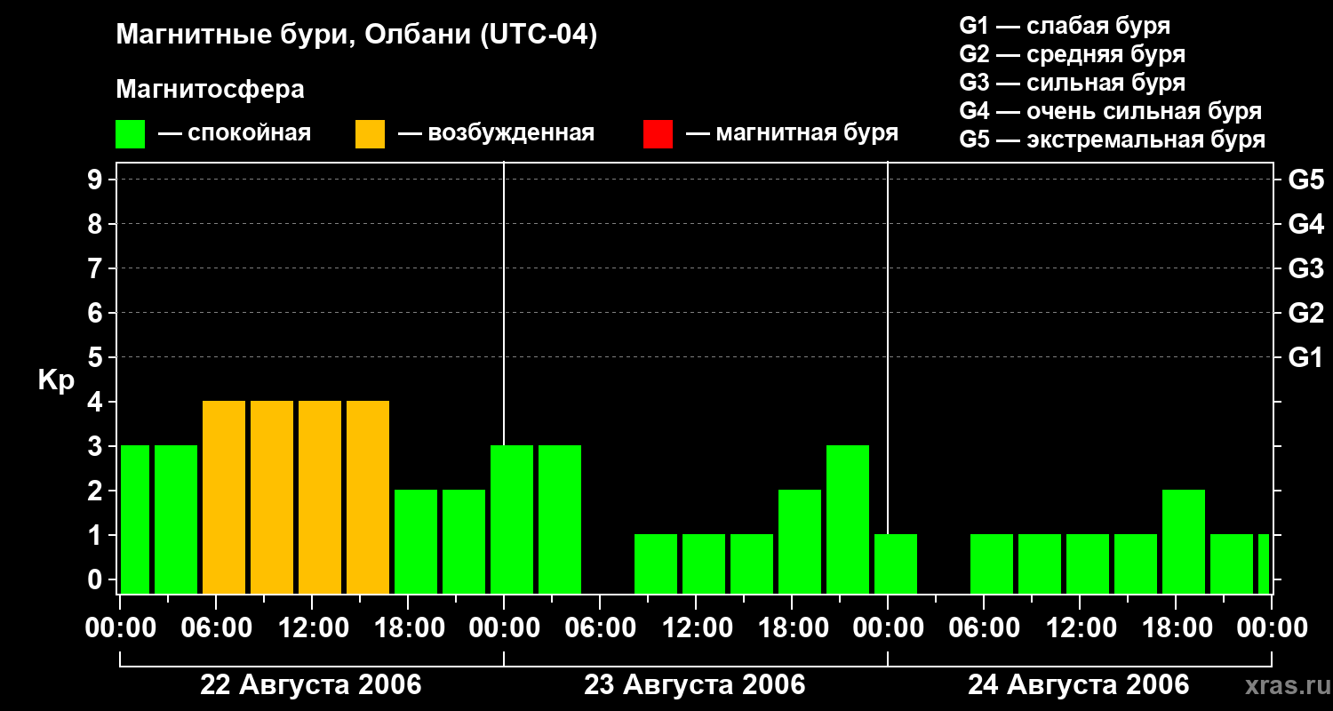 Изменения геомагнитного индекса Kp с 22 по 24 августа 2006 года для средних широт