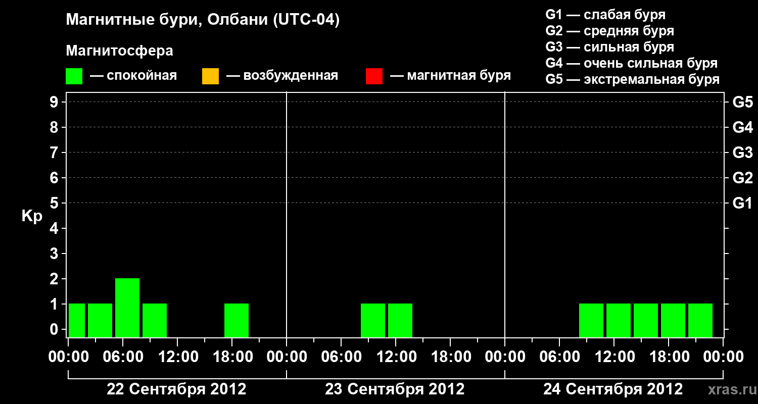 Изменения геомагнитного индекса Kp с 22 по 24 сентября 2012 года для средних широт