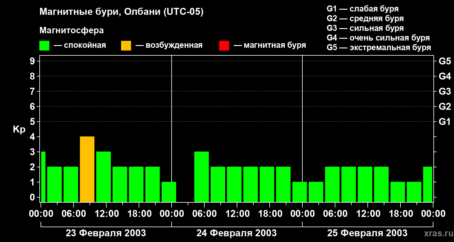 Изменения геомагнитного индекса Kp с 23 по 25 февраля 2003 года для средних широт