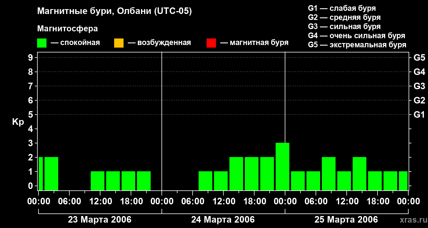 Изменения геомагнитного индекса Kp с 23 по 25 марта 2006 года для средних широт