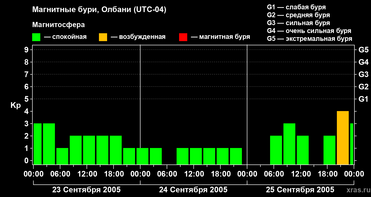 Изменения геомагнитного индекса Kp с 23 по 25 сентября 2005 года для средних широт