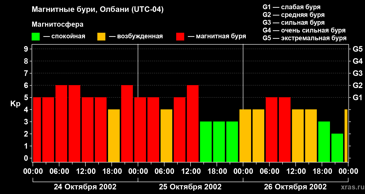 Изменения геомагнитного индекса Kp с 24 по 26 октября 2002 года для средних широт
