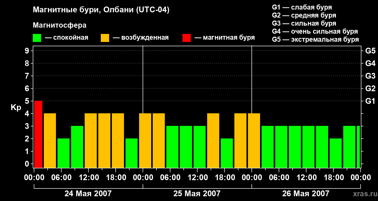 Изменения геомагнитного индекса Kp с 24 по 26 мая 2007 года для средних широт