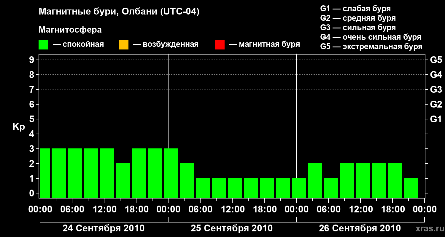 Изменения геомагнитного индекса Kp с 24 по 26 сентября 2010 года для средних широт