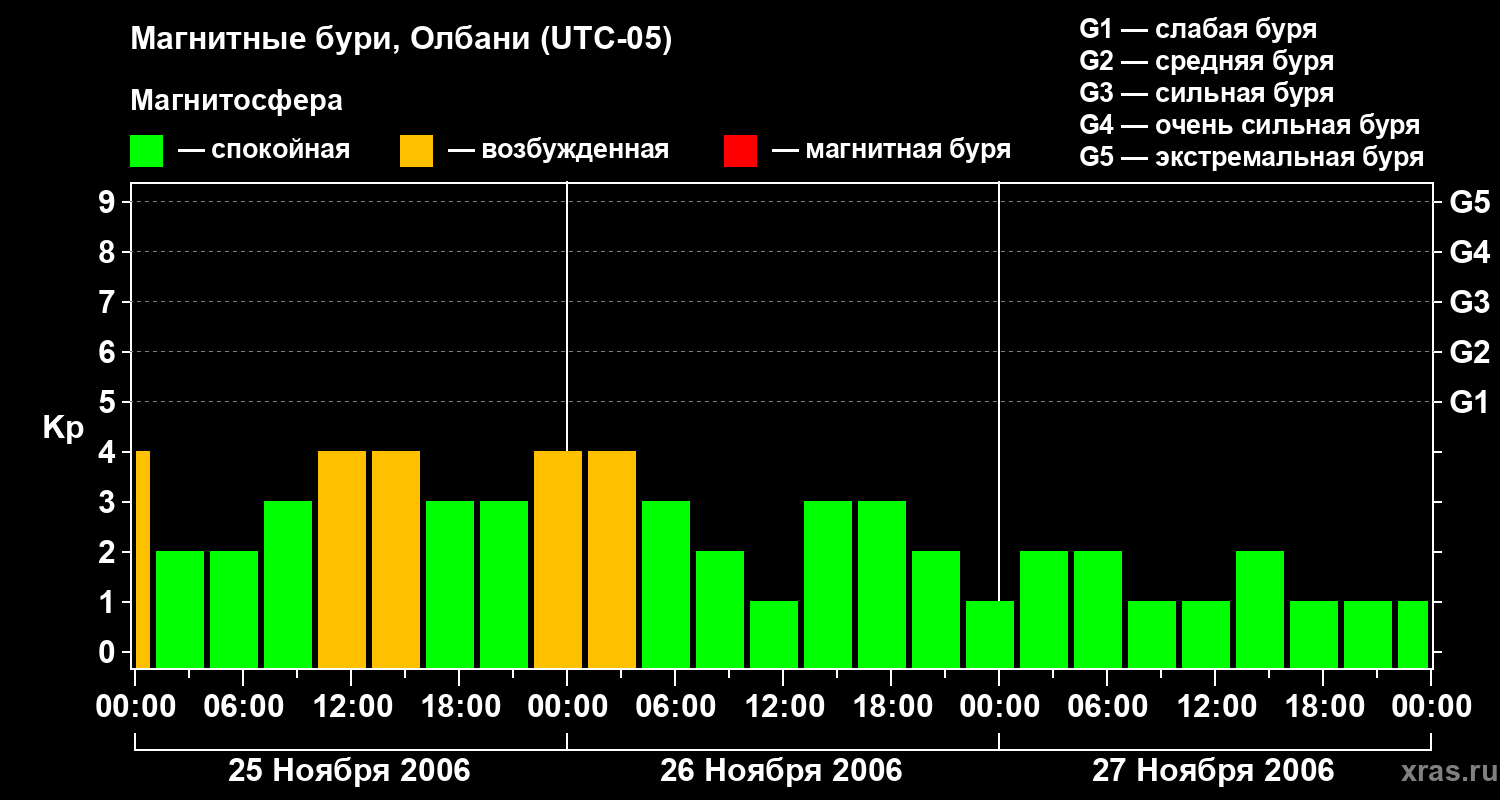 Изменения геомагнитного индекса Kp с 25 по 27 ноября 2006 года для средних широт