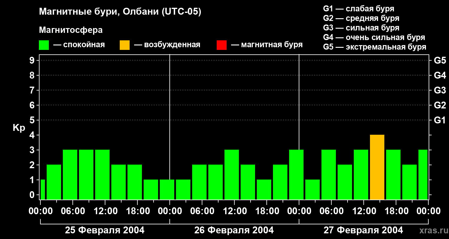 Изменения геомагнитного индекса Kp с 25 по 27 февраля 2004 года для средних широт