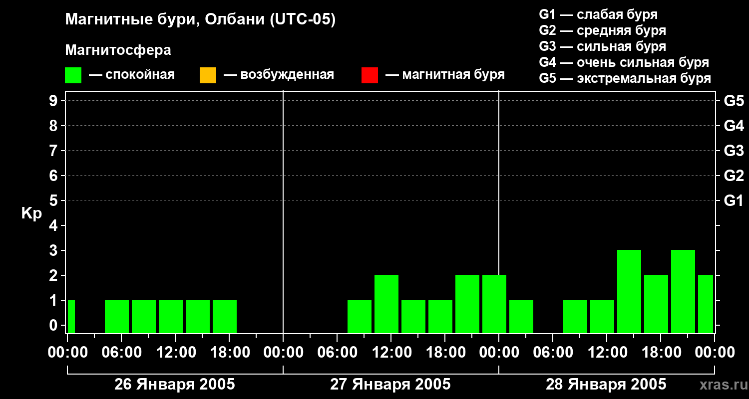 Изменения геомагнитного индекса Kp с 26 по 28 января 2005 года для средних широт