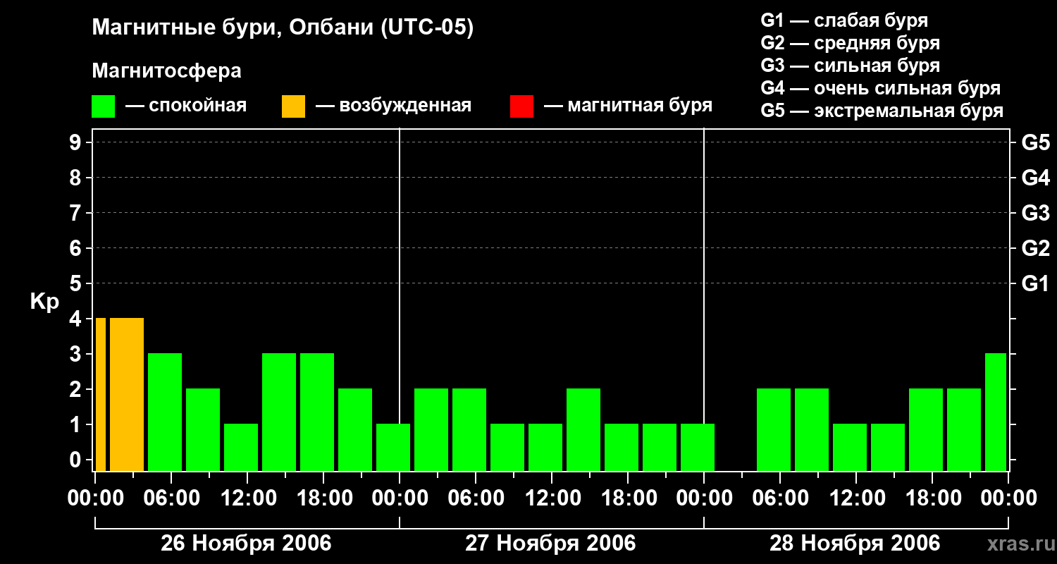 Изменения геомагнитного индекса Kp с 26 по 28 ноября 2006 года для средних широт