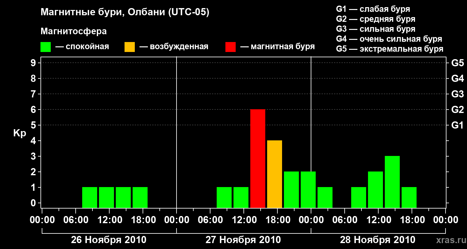 Изменения геомагнитного индекса Kp с 26 по 28 ноября 2010 года для средних широт