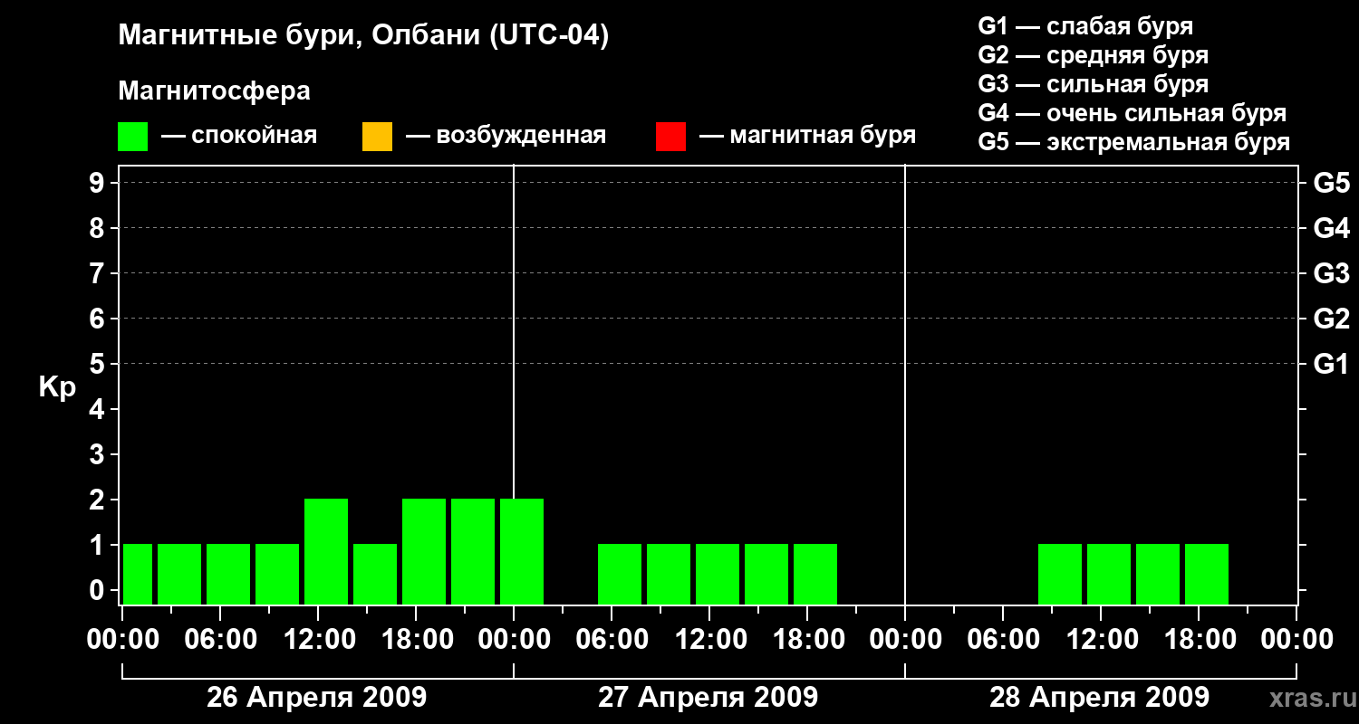 Изменения геомагнитного индекса Kp с 26 по 28 апреля 2009 года для средних широт