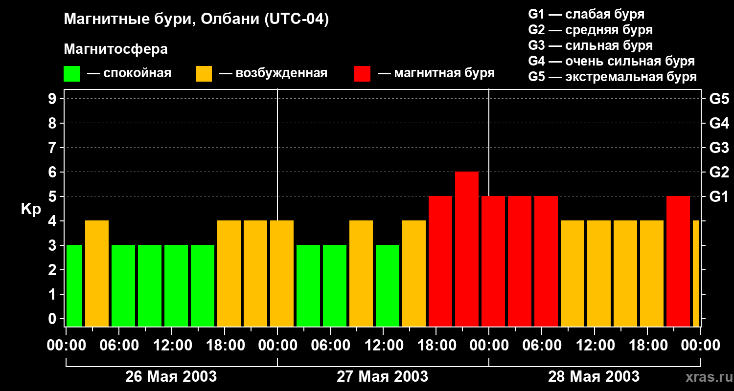 Изменения геомагнитного индекса Kp с 26 по 28 мая 2003 года для средних широт