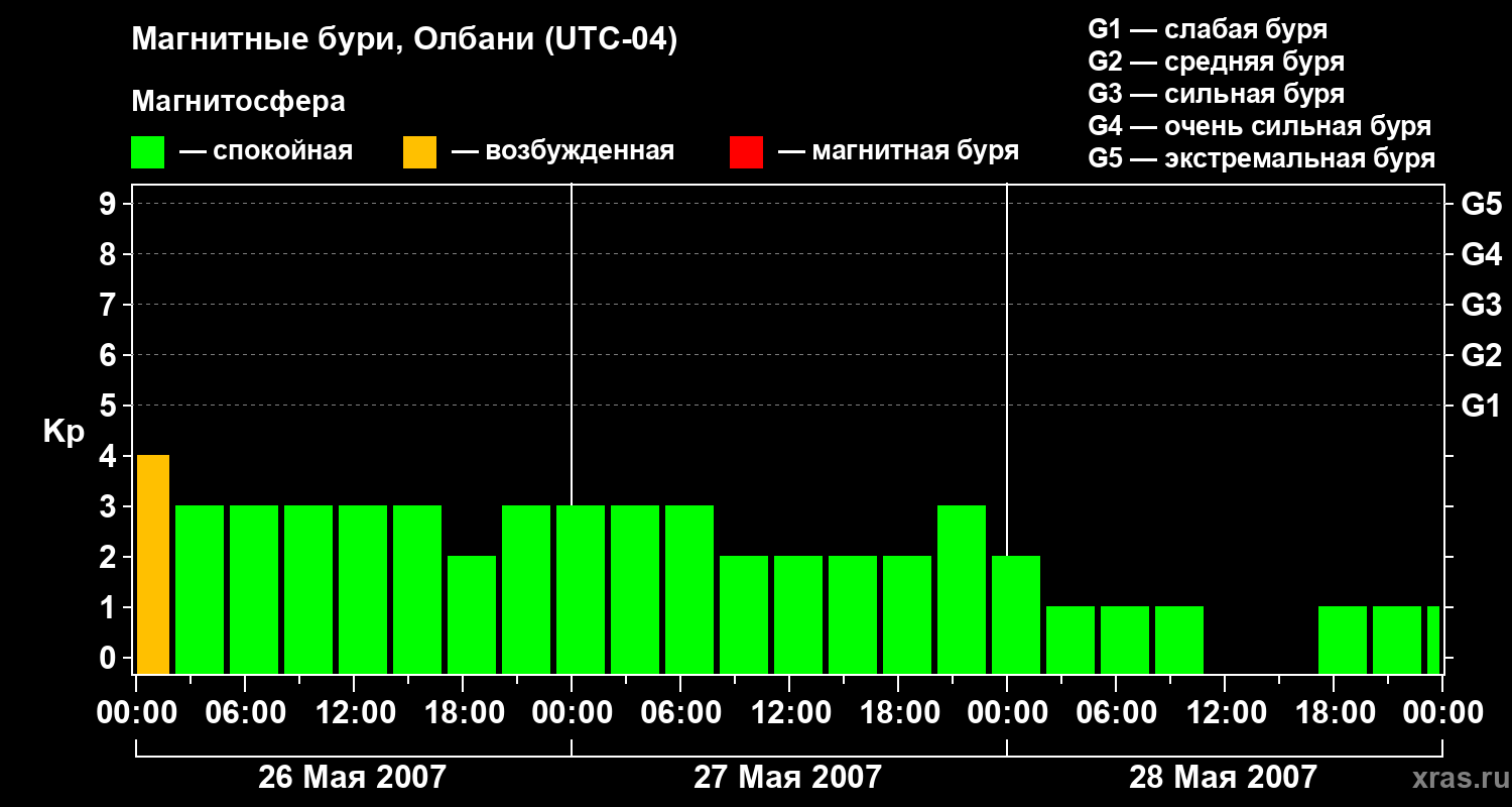 Изменения геомагнитного индекса Kp с 26 по 28 мая 2007 года для средних широт