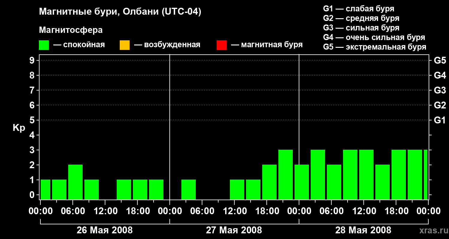 Изменения геомагнитного индекса Kp с 26 по 28 мая 2008 года для средних широт