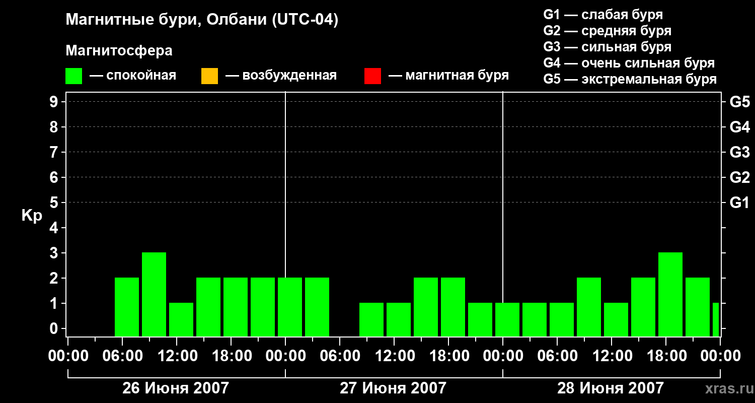 Изменения геомагнитного индекса Kp с 26 по 28 июня 2007 года для средних широт