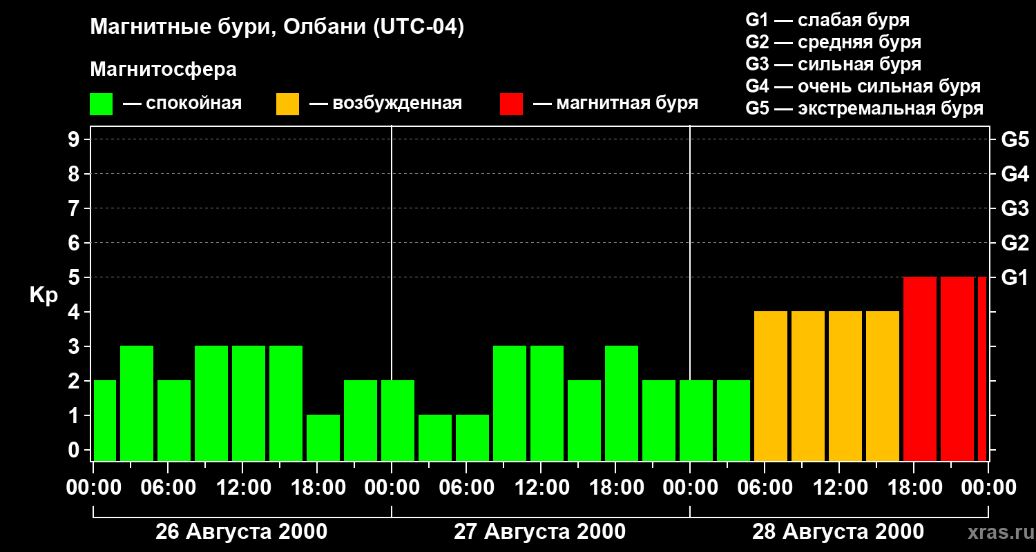 Изменения геомагнитного индекса Kp с 26 по 28 августа 2000 года для средних широт