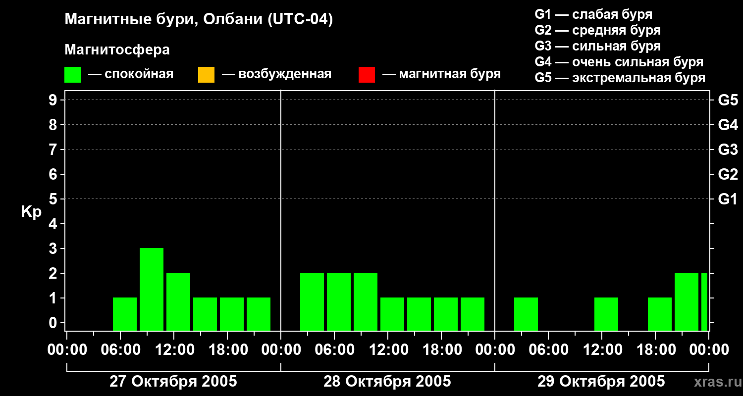 Изменения геомагнитного индекса Kp с 27 по 29 октября 2005 года для средних широт