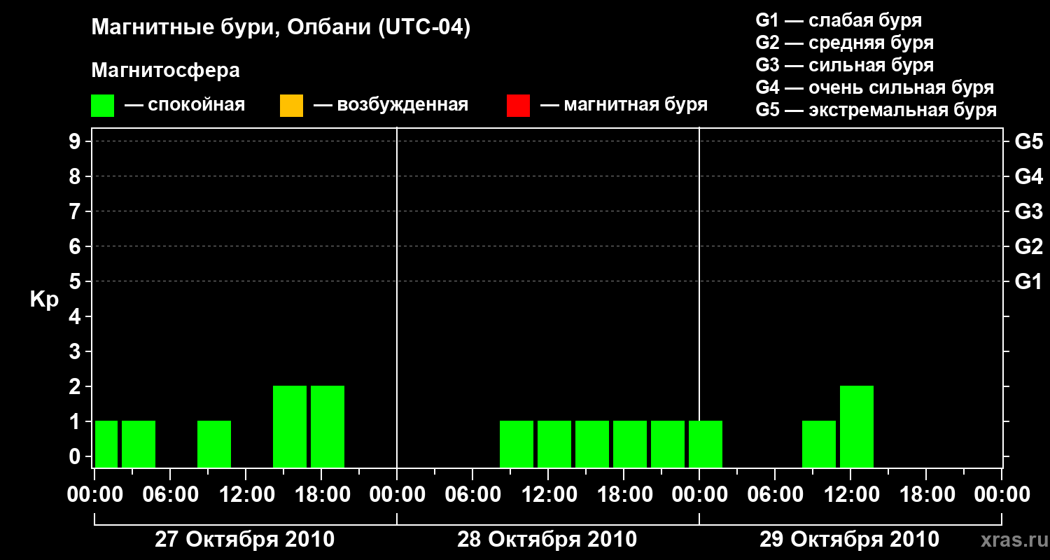 Изменения геомагнитного индекса Kp с 27 по 29 октября 2010 года для средних широт