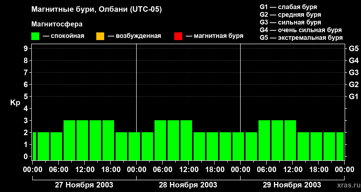Изменения геомагнитного индекса Kp с 27 по 29 ноября 2003 года для средних широт