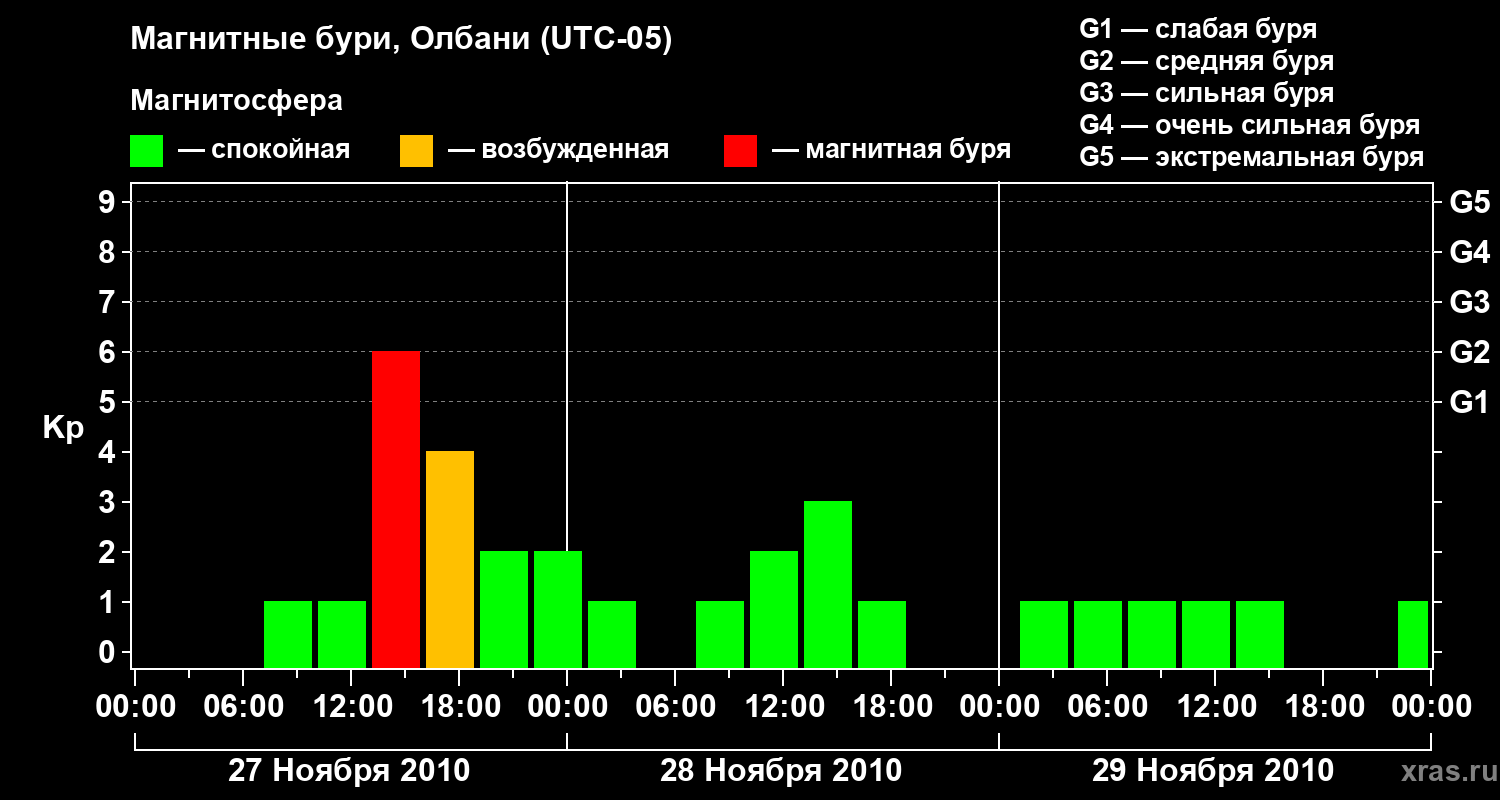 Изменения геомагнитного индекса Kp с 27 по 29 ноября 2010 года для средних широт