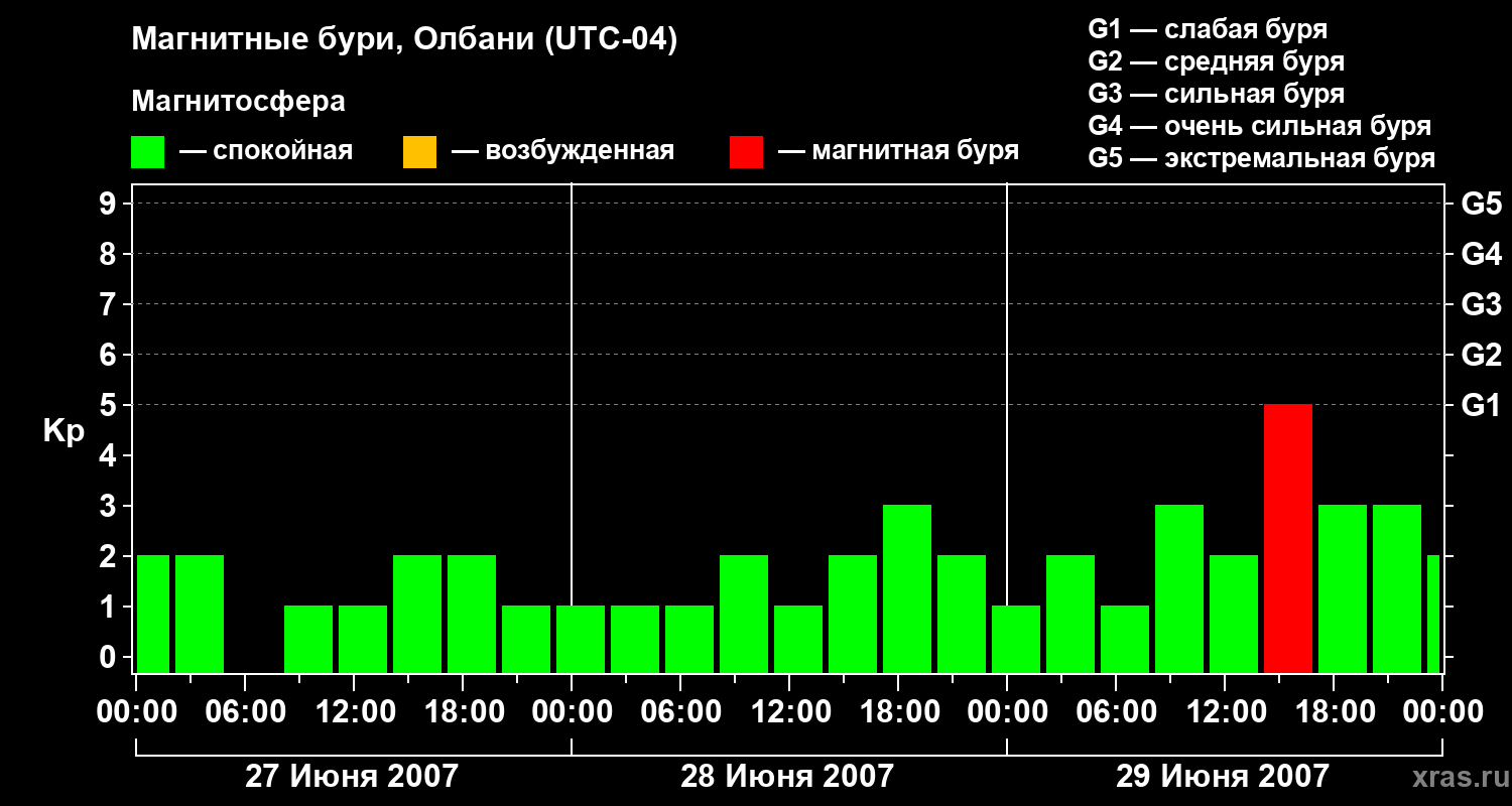 Изменения геомагнитного индекса Kp с 27 по 29 июня 2007 года для средних широт