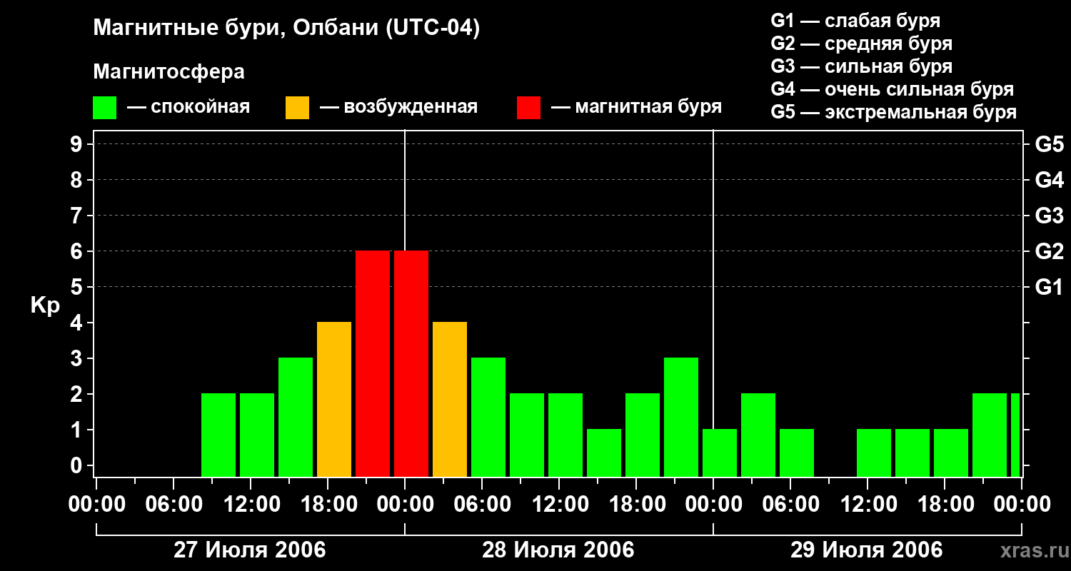 Изменения геомагнитного индекса Kp с 27 по 29 июля 2006 года для средних широт