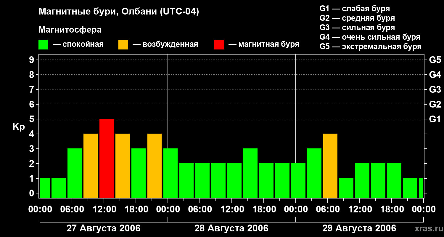 Изменения геомагнитного индекса Kp с 27 по 29 августа 2006 года для средних широт