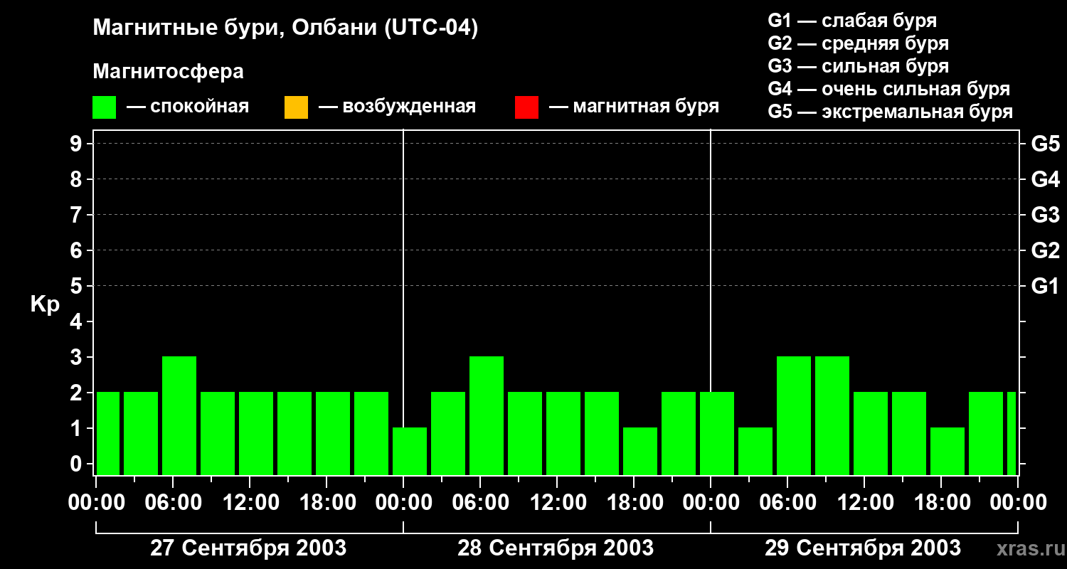 Изменения геомагнитного индекса Kp с 27 по 29 сентября 2003 года для средних широт