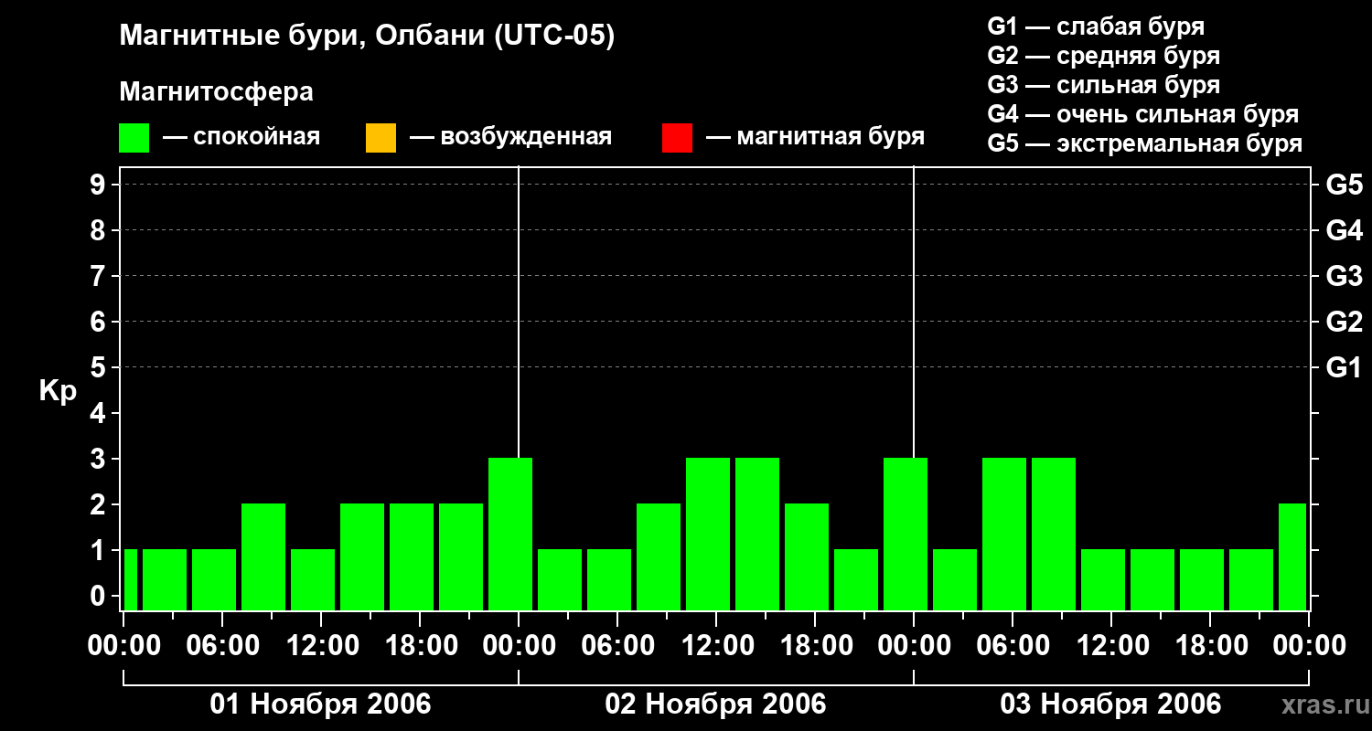 Изменения геомагнитного индекса Kp с 1 по 3 ноября 2006 года для средних широт