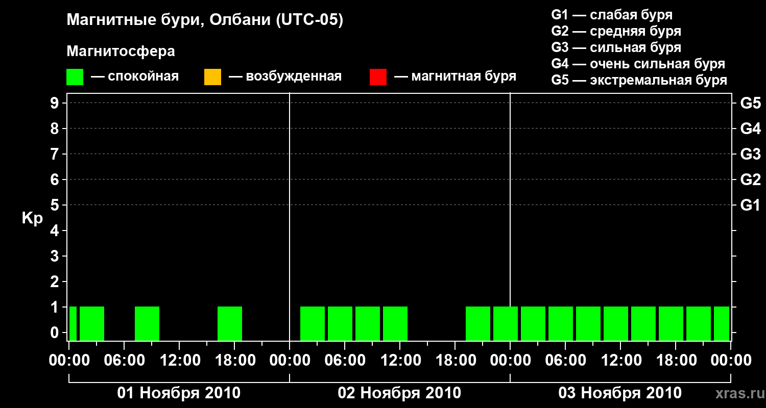 Изменения геомагнитного индекса Kp с 1 по 3 ноября 2010 года для средних широт