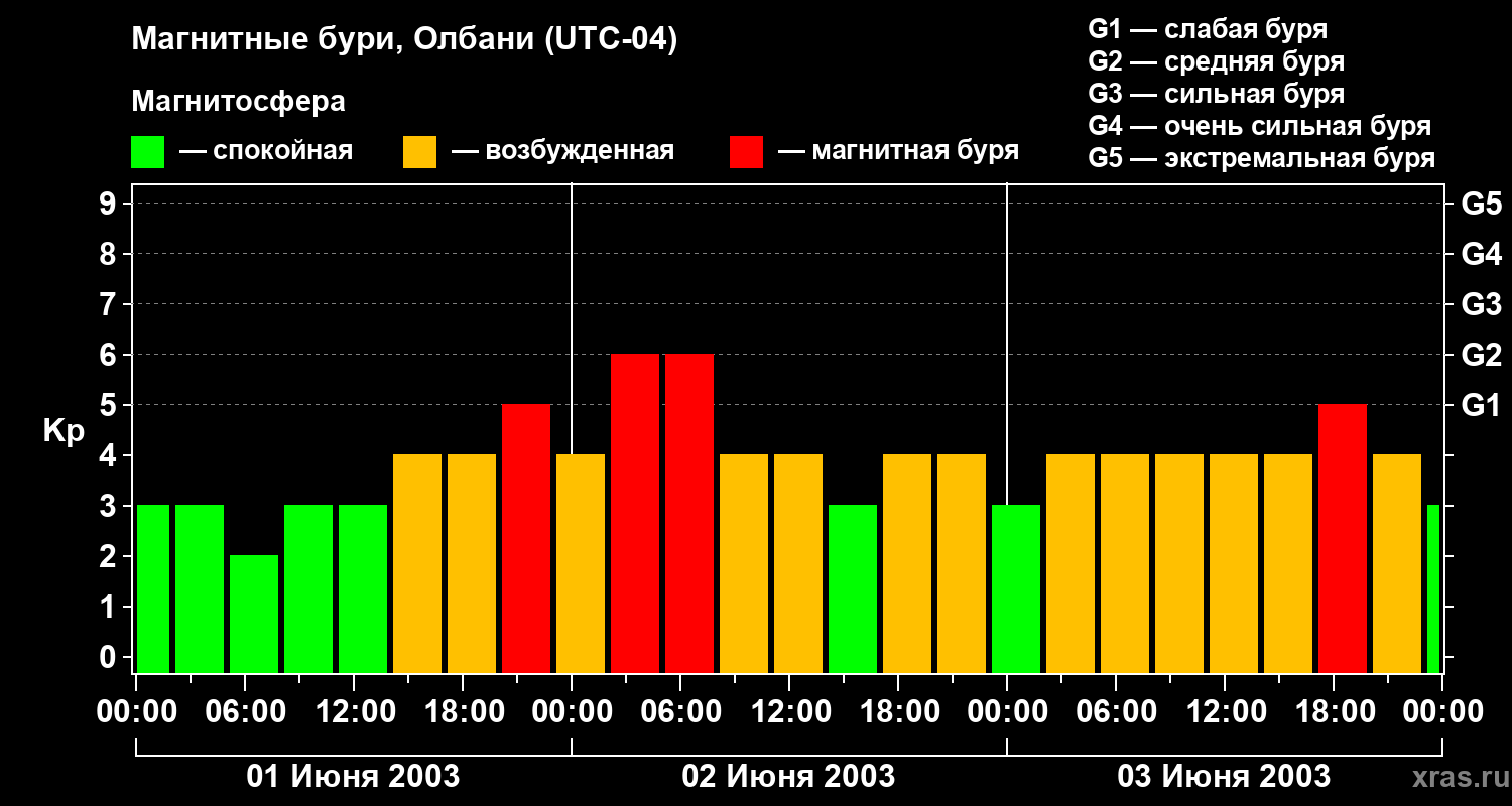 Изменения геомагнитного индекса Kp с 1 по 3 июня 2003 года для средних широт
