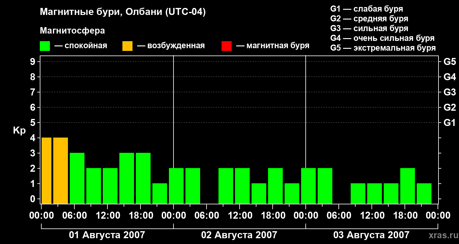 Изменения геомагнитного индекса Kp с 1 по 3 августа 2007 года для средних широт