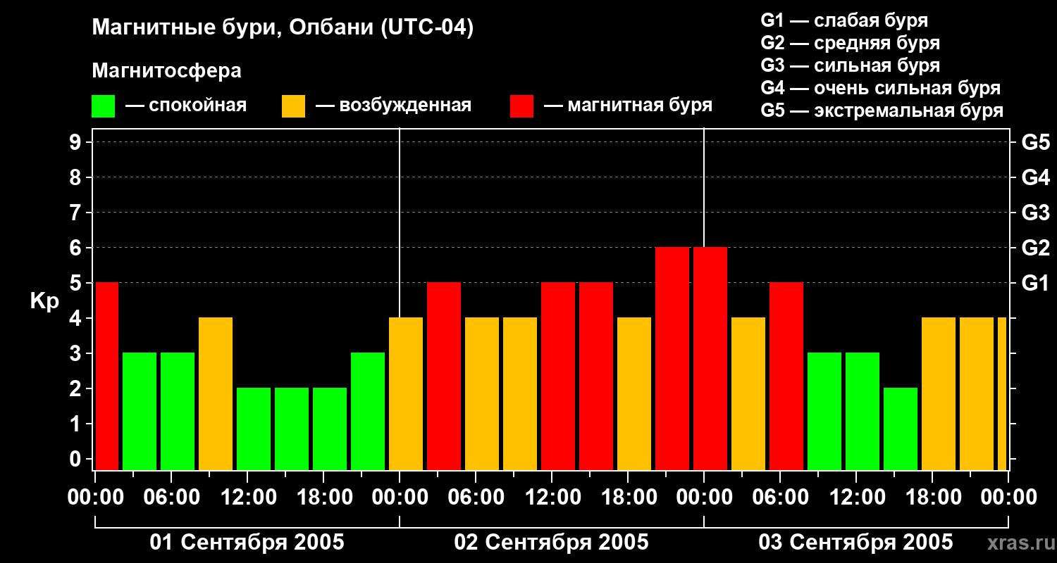 Изменения геомагнитного индекса Kp с 1 по 3 сентября 2005 года для средних широт
