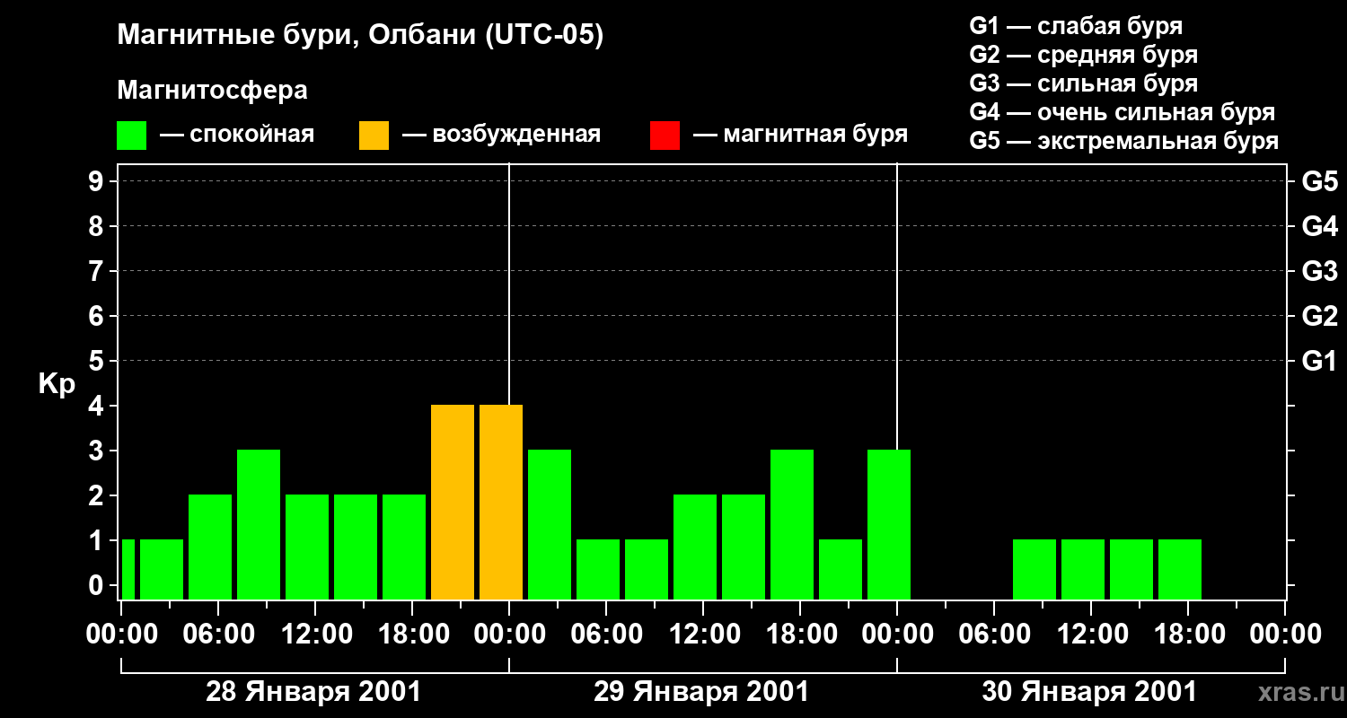 Изменения геомагнитного индекса Kp с 28 по 30 января 2001 года для средних широт