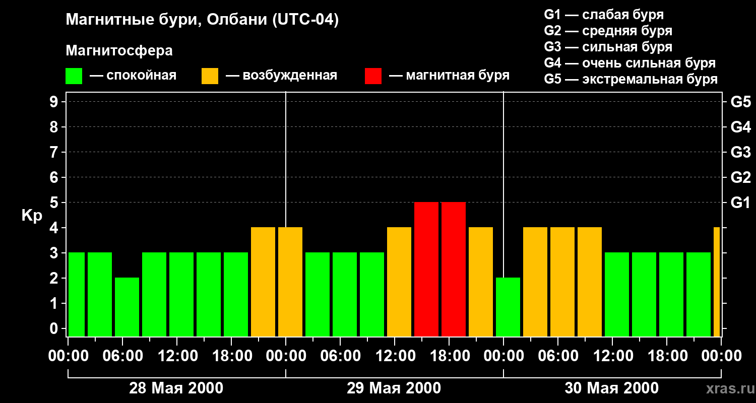 Изменения геомагнитного индекса Kp с 28 по 30 мая 2000 года для средних широт