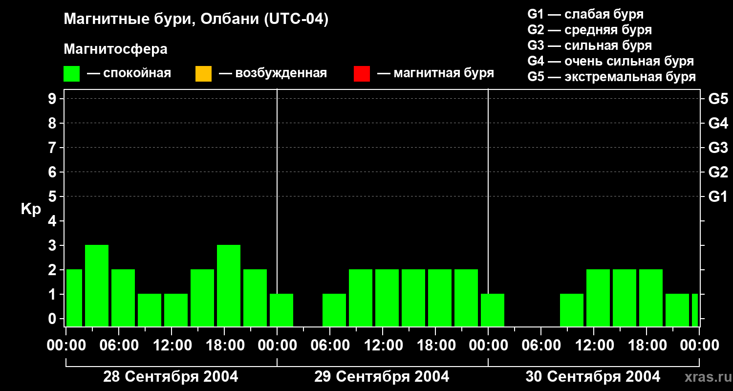 Изменения геомагнитного индекса Kp с 28 по 30 сентября 2004 года для средних широт