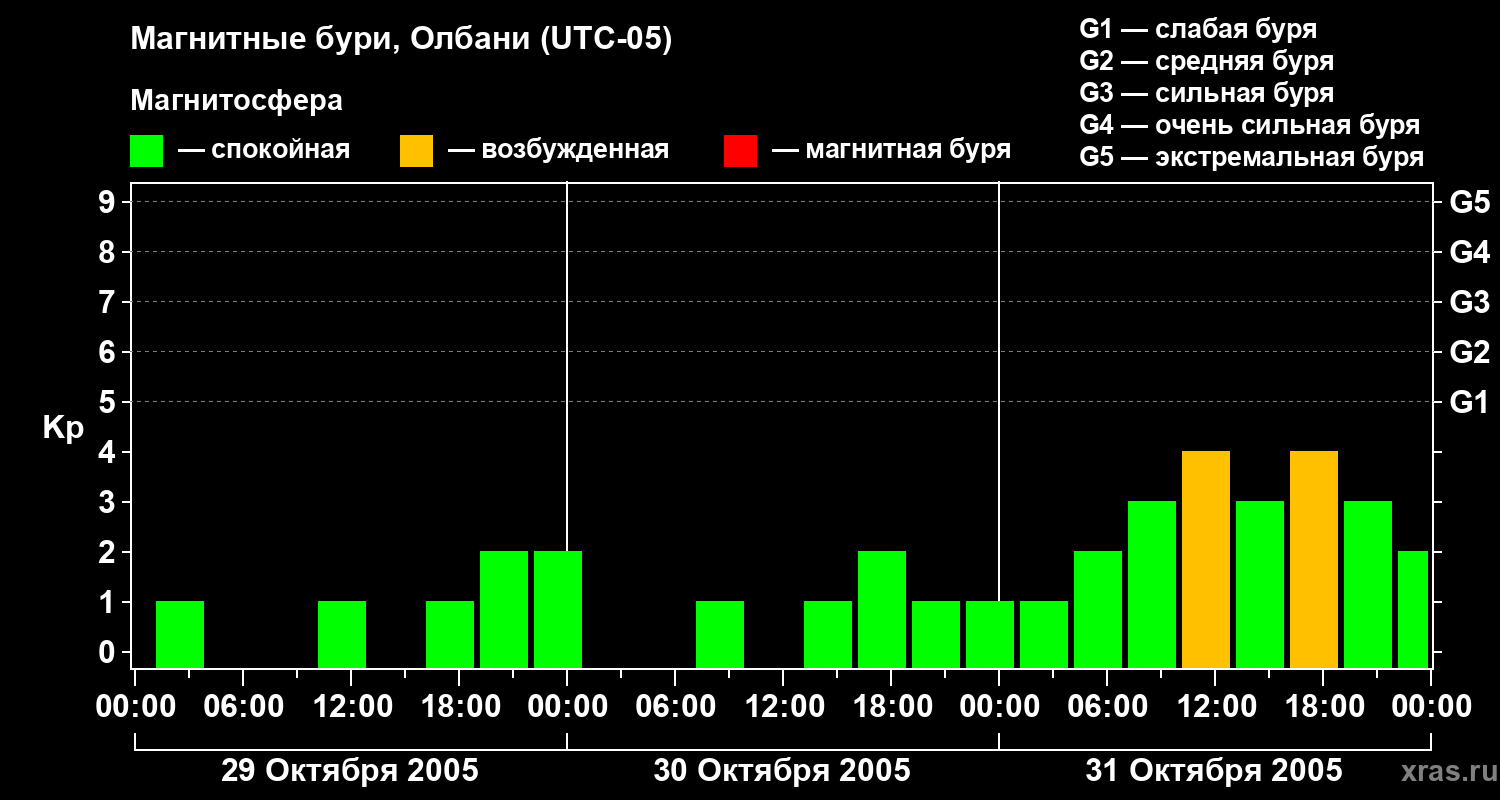 Изменения геомагнитного индекса Kp с 29 по 31 октября 2005 года для средних широт