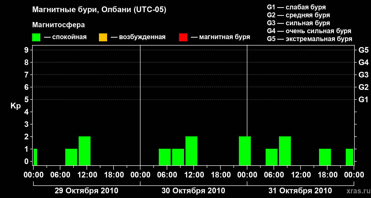 Изменения геомагнитного индекса Kp с 29 по 31 октября 2010 года для средних широт