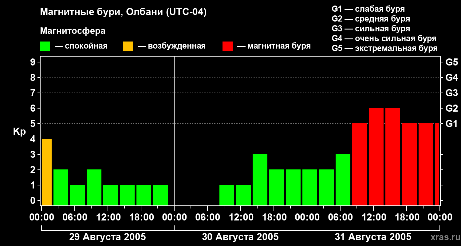 Изменения геомагнитного индекса Kp с 29 по 31 августа 2005 года для средних широт