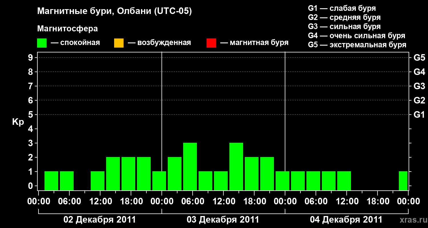 Изменения геомагнитного индекса Kp с 2 по 4 декабря 2011 года для средних широт