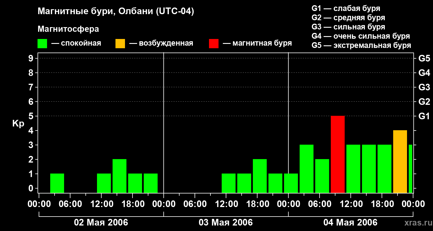 Изменения геомагнитного индекса Kp с 2 по 4 мая 2006 года для средних широт