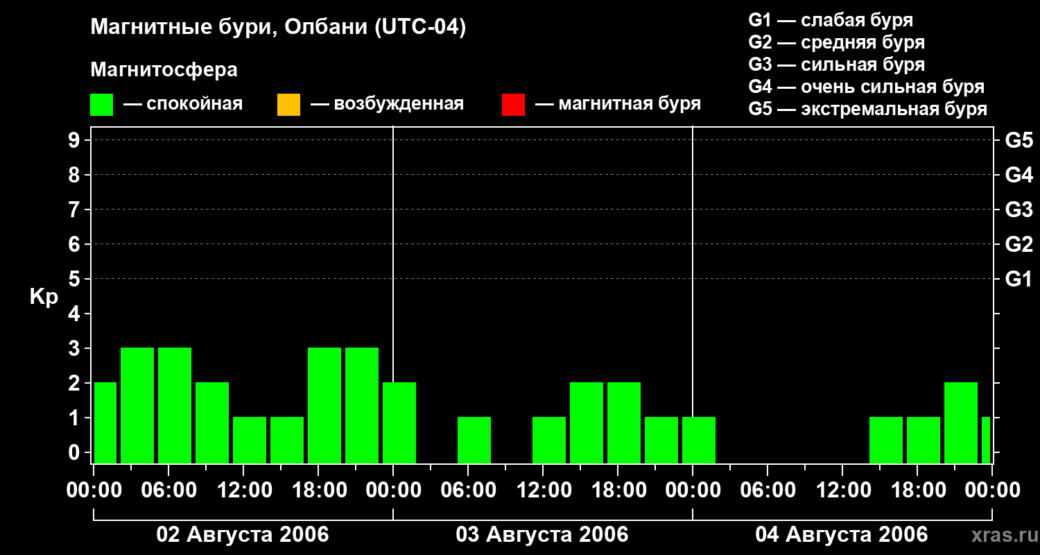 Изменения геомагнитного индекса Kp с 2 по 4 августа 2006 года для средних широт