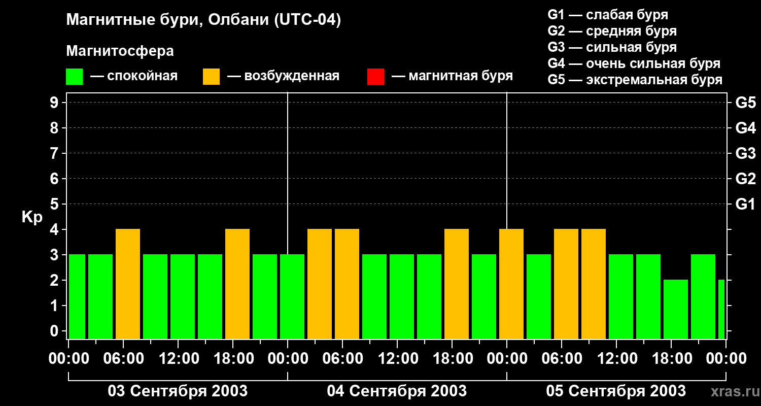 Изменения геомагнитного индекса Kp с 3 по 5 сентября 2003 года для средних широт