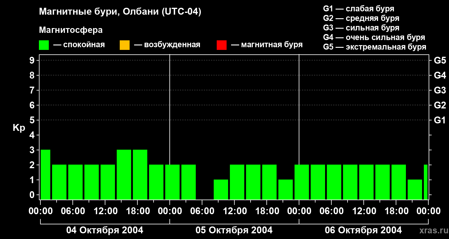 Изменения геомагнитного индекса Kp с 4 по 6 октября 2004 года для средних широт