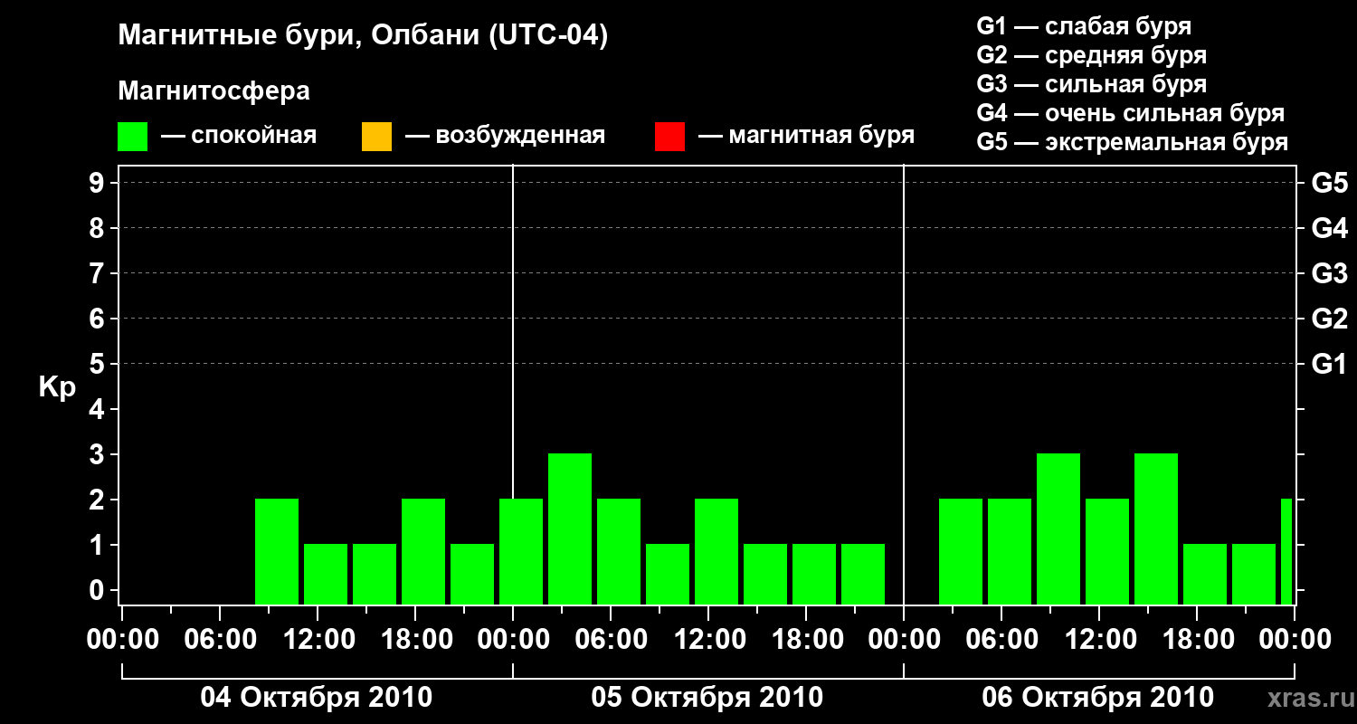 Изменения геомагнитного индекса Kp с 4 по 6 октября 2010 года для средних широт