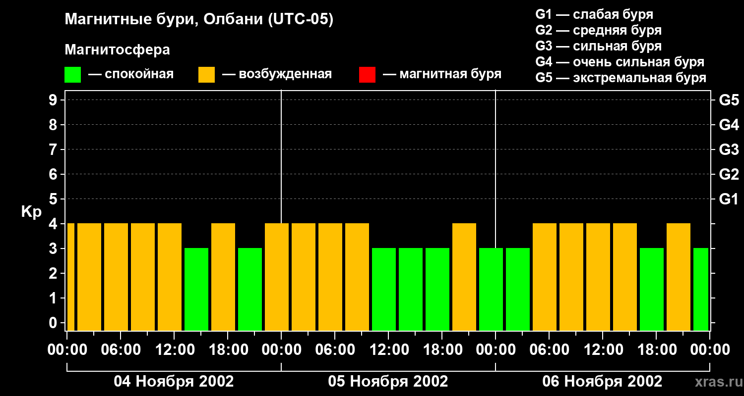 Изменения геомагнитного индекса Kp с 4 по 6 ноября 2002 года для средних широт