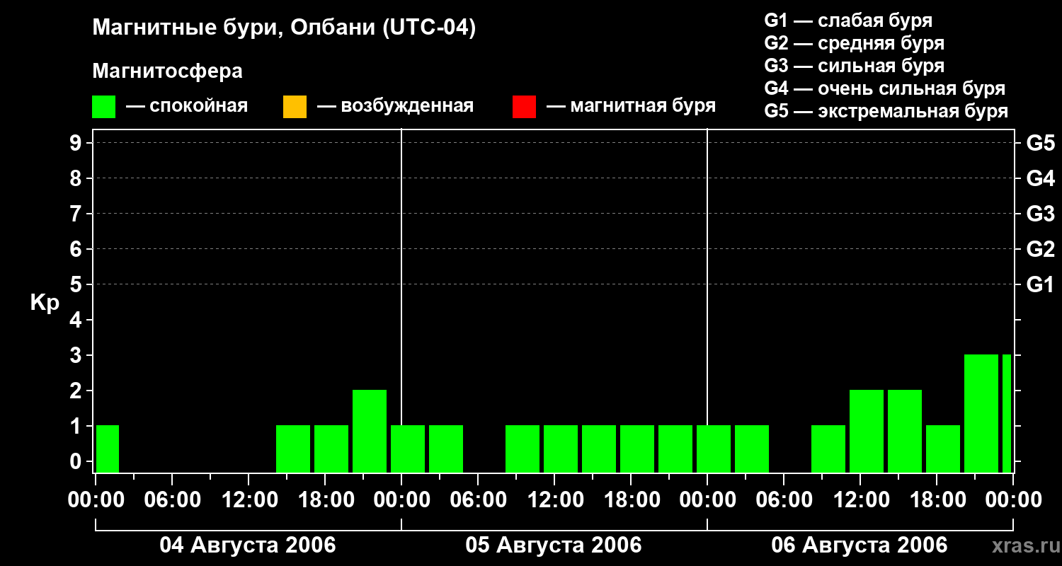 Изменения геомагнитного индекса Kp с 4 по 6 августа 2006 года для средних широт